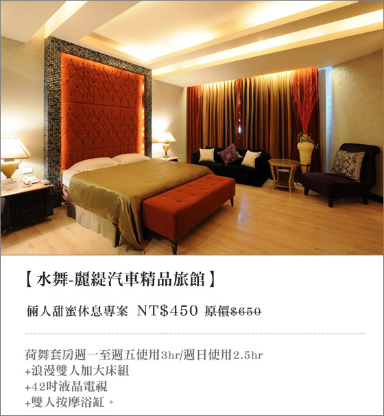 只要450元(雙人價)即可享有【水舞-麗緹汽車精品旅館】原價650元倆人甜蜜休息專案:荷舞套房週一至週五使用3hr/週日使用2.5hr+浪漫雙人加大床組+42吋液晶電視+雙人按摩浴缸?