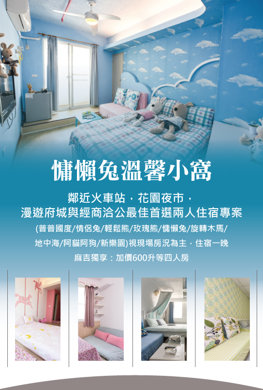 只要960元,即可享有【台南-慵懶兔溫馨小窩】鄰近火車站,花園夜市,漫遊府城與經商洽公最佳首選兩人住宿專案〈含(普普國度/情侶兔/輕鬆熊/玫瑰熊/慵懶兔/旋轉木馬/地中海/阿貓阿狗/新樂園)視現場房況為主,住宿一晚〉麻吉獨享:加價600升等四人房
