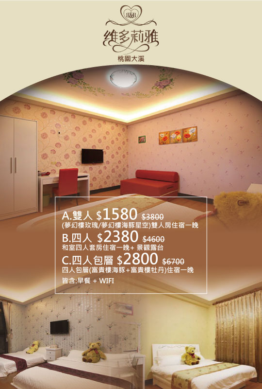 只要1580元起,即可享有【桃園大溪-維多莉雅民宿】遊玩桃園、大溪各景點的中繼站!雙人、四人住宿方案〈含A.(夢幻樓玫瑰/夢幻樓海豚星空)雙人房/B.和室四人套房/C.四人包層(富貴樓海豚+富貴樓牡丹) 住宿一晚 + 早餐 + WIFI,B方案另含景觀露台〉